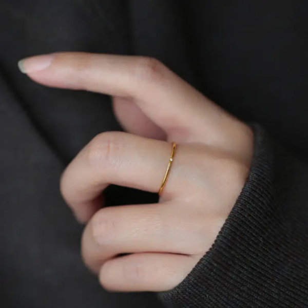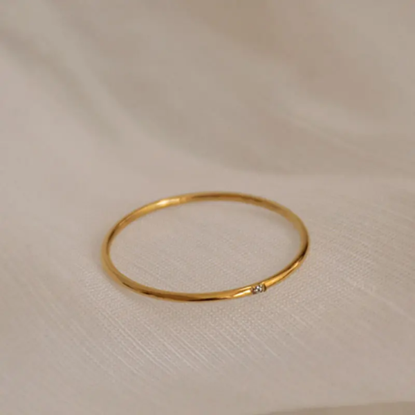 A delicate gold ring adorned with a single sparkling stone — timeless, minimal, and effortlessly chic.